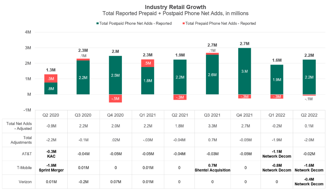 When we look at the impact of the adjustments, a different view emerges. For example, in Q2 2020 there were two significant adjustments: a clean-up of the Keep America Connected disconnects by AT&T and, more importantly, a large adjustment by T-Mobile as part of the Sprint merger. Sprint had created a bit of a mess ahead of the merger and counted people as customers who might really live up to that moniker. It counted some connected devices as phones, didn’t disconnect people even though they were significantly in arrears, and counted prepaid Boost customers who financed a device as postpaid. As a result, 1.9 million subscribers disappeared from the books. The total subscriber numbers actually show a reduction of 900k subscribers despite an “official” 1.3 million subscriber gain. We saw a similar trend due to the 3G network shutdown at AT&T and T-Mobile. What looked like strong subscriber gain quarters were actually flat quarters due to the disconnects of 1.9 million and 2 million 3G subscribers. We will see further adjustments when Verizon shuts down its 3G later in the year.
