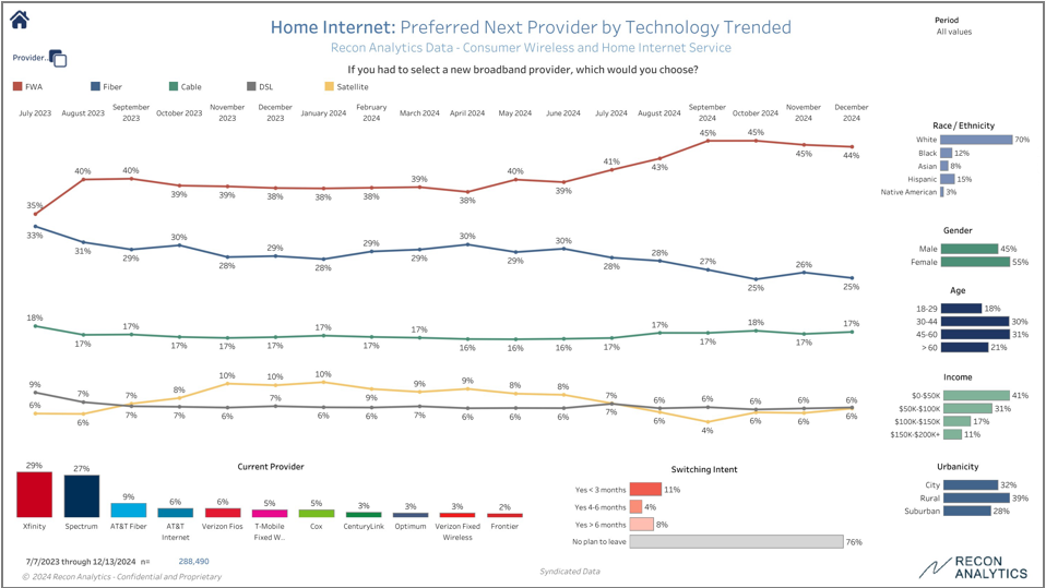 Based on interviews with 288,490 Americans conducted between July 2023 and December 2024, 44% of Americans would choose an FWA as their next provider if they would have to make a choice other than their existing provider, 25% would choose a fiber provider, 17% a cable provider, and 6% each would choose DSL or a satellite provider (predominantly Starlink.)