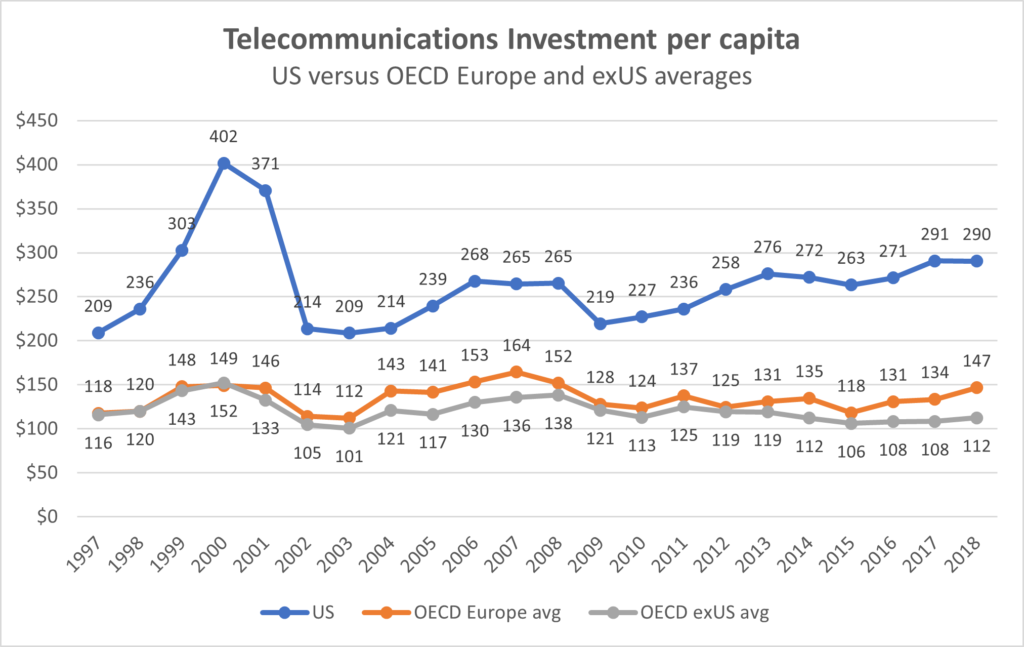 All that the paper appears to say in response to the investment history presented in above chart is to note that since 2015, “investment by the main Telecom operators in Europe has grown rather quickly.” So it has; but so has investment grown in the U.S. – and U.S. per capita investment levels remain at nearly twice those in Europe.