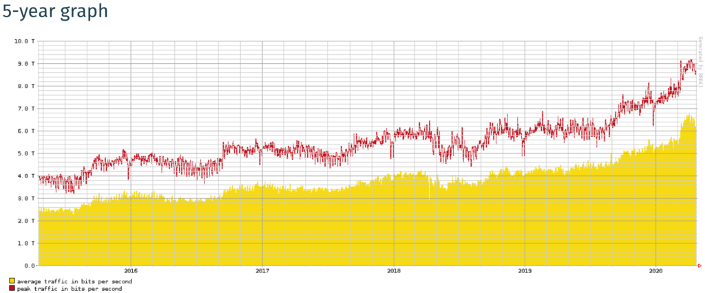 Europe’s largest internet exchange, DE-CIX is publishing its usage and performance data in real time for all its internet exchange points. Below is the 5-year traffic graph for Frankfurt from April 21, 2020s, the world’s largest internet exchange point: